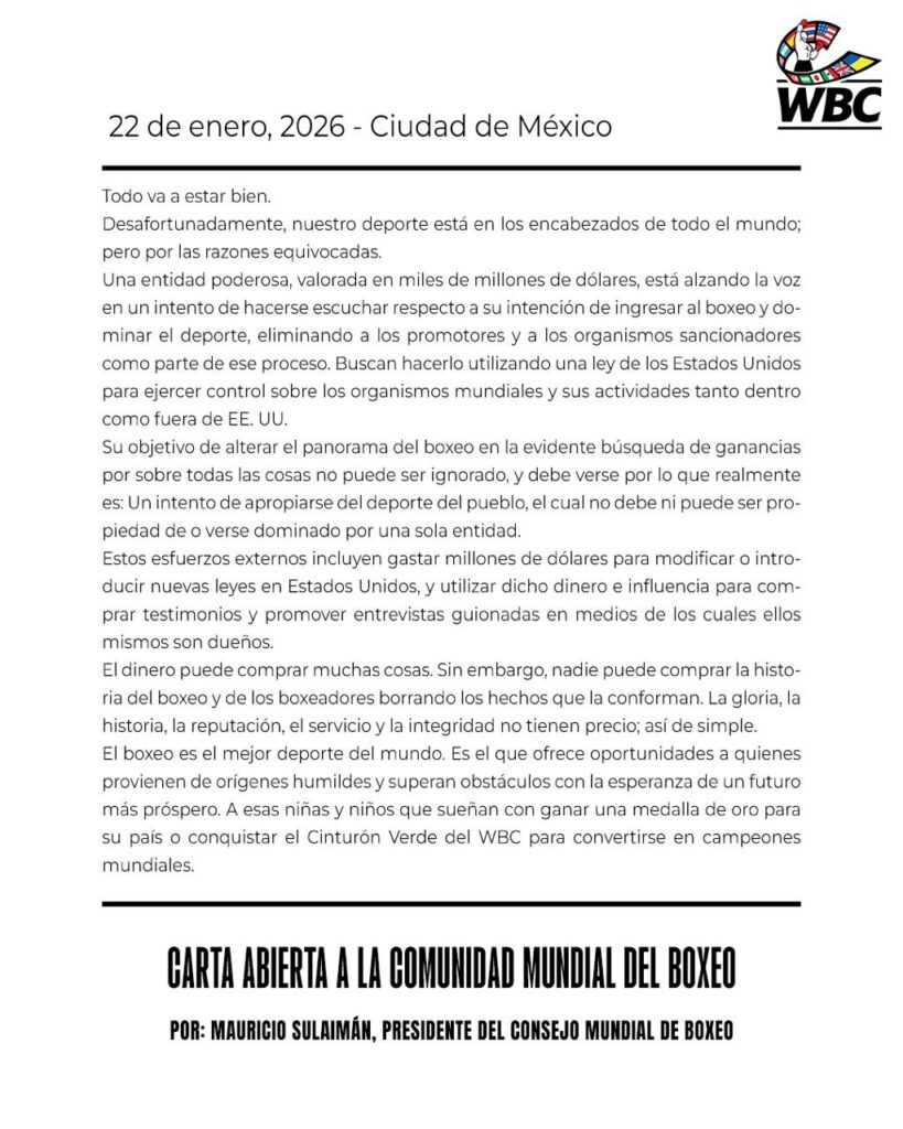 Se esperan más declaraciones en los próximos días y una toma de posiciones más clara tanto de los organismos como de Zuffa. Sin embargo, resulta complicado que el WBC y Mauricio Sulaimán pierdan su jerarquía, ya que el organismo Verde y Oro, por su trayectoria y acciones, continúa siendo el líder mundial del deporte de los puños.